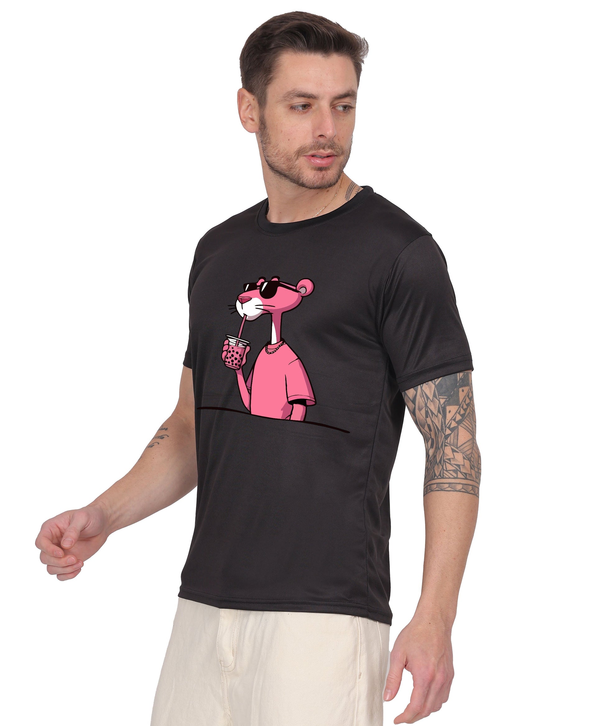 Make a bold statement with this eye-catching black t-shirt featuring a cool Pink Panther graphic design. The iconic character is stylishly rendered in vibrant pink, sporting sunglasses and exuding attitude. Crafted from soft cotton fabric, this casual round-neck t-shirt offers both comfort and style for everyday wear. The striking contrast between the black base and pink graphic creates a memorable look that's sure to turn heads. Perfect for casual outings, this t-shirt can be easily paired with jeans, shorts, or casual trousers. The classic fit suits various body types, while the quality cotton material ensures breathability and comfort throughout the day. The playful yet sophisticated design makes it an excellent choice for both casual wear and informal gatherings. Available in multiple sizes, this t-shirt combines pop culture appeal with contemporary fashion sensibilities.